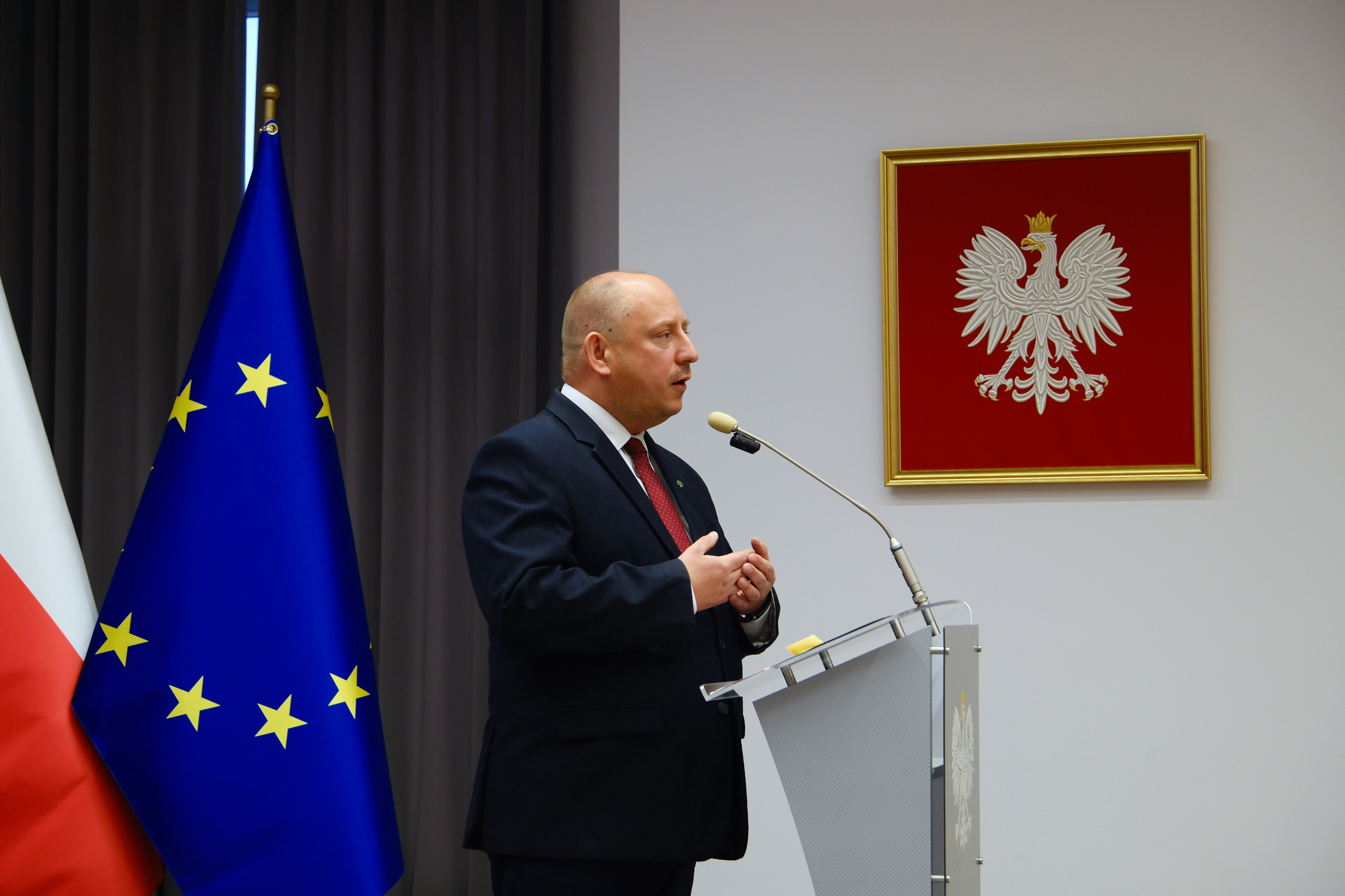 Wojewoda małopolski Krzysztof Jan Klęczar przemawiający przy mównicy na tle ekranu.