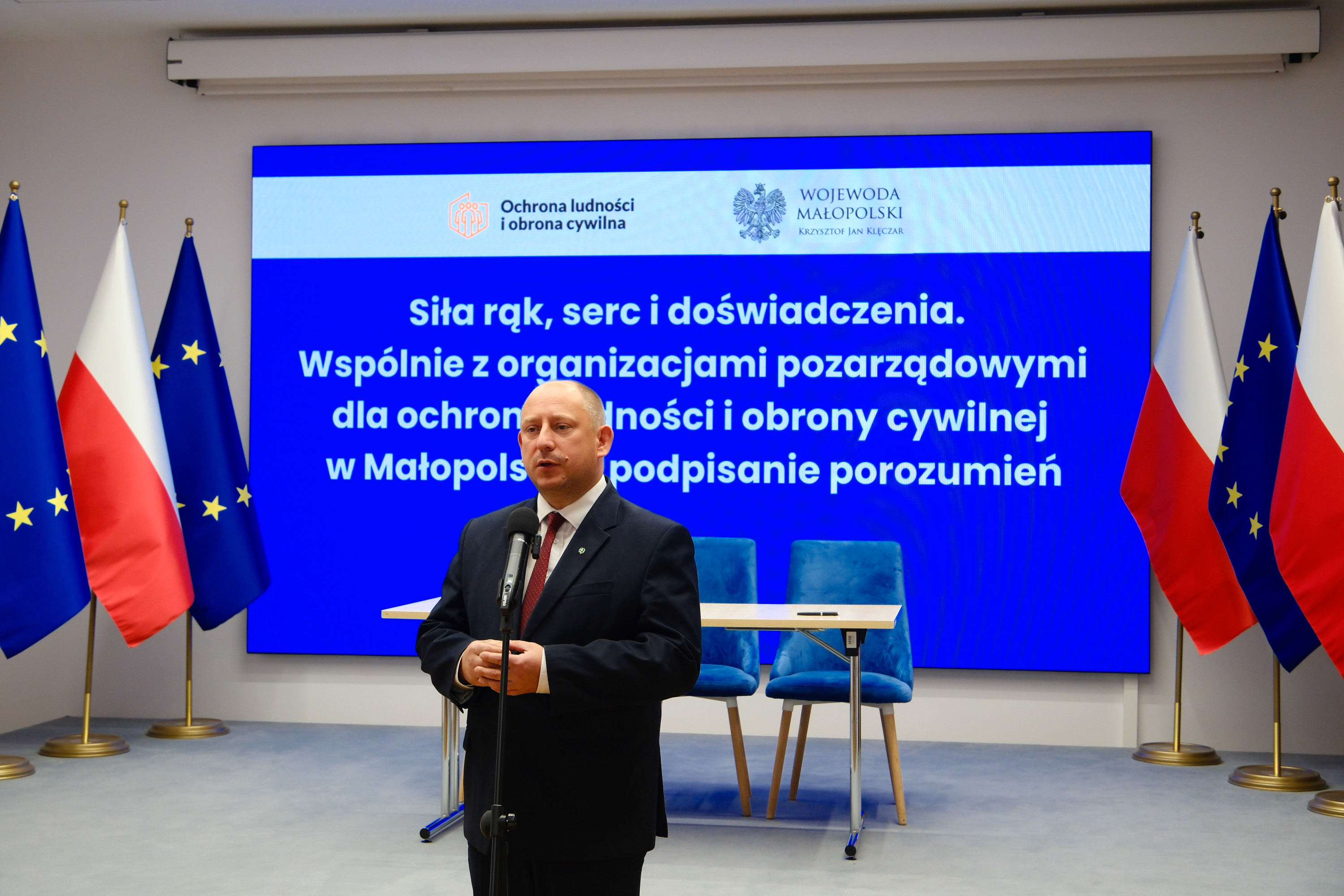 - O potencjale organizacji pozarządowych mogliśmy się już niejednokrotnie przekonać – nieraz w bardzo trudnych sytuacjach. To siła rąk i serc, ale i moc praktycznych doświadczeń oraz wielkiego zaufania społecznego. Nie wyobrażam sobie budowania skutecznego systemu ochrony ludności i obrony ludności bez organizacji pozarządowych. Porozumienia, które dziś podpisujemy, dotyczą m.in. współpracy w zakresie przygotowania kadry podmiotów ochrony ludności do efektywnej realizacji zadań, czyli szeroko pojętych szkoleń. Ale to także kwestia choćby pomocy humanitarnej, która jest tak istotna w sytuacjach kryzysowych, oraz wspólnego budowania społecznej odporności - mówi wojewoda małopolski Krzysztof Jan Klęczar.