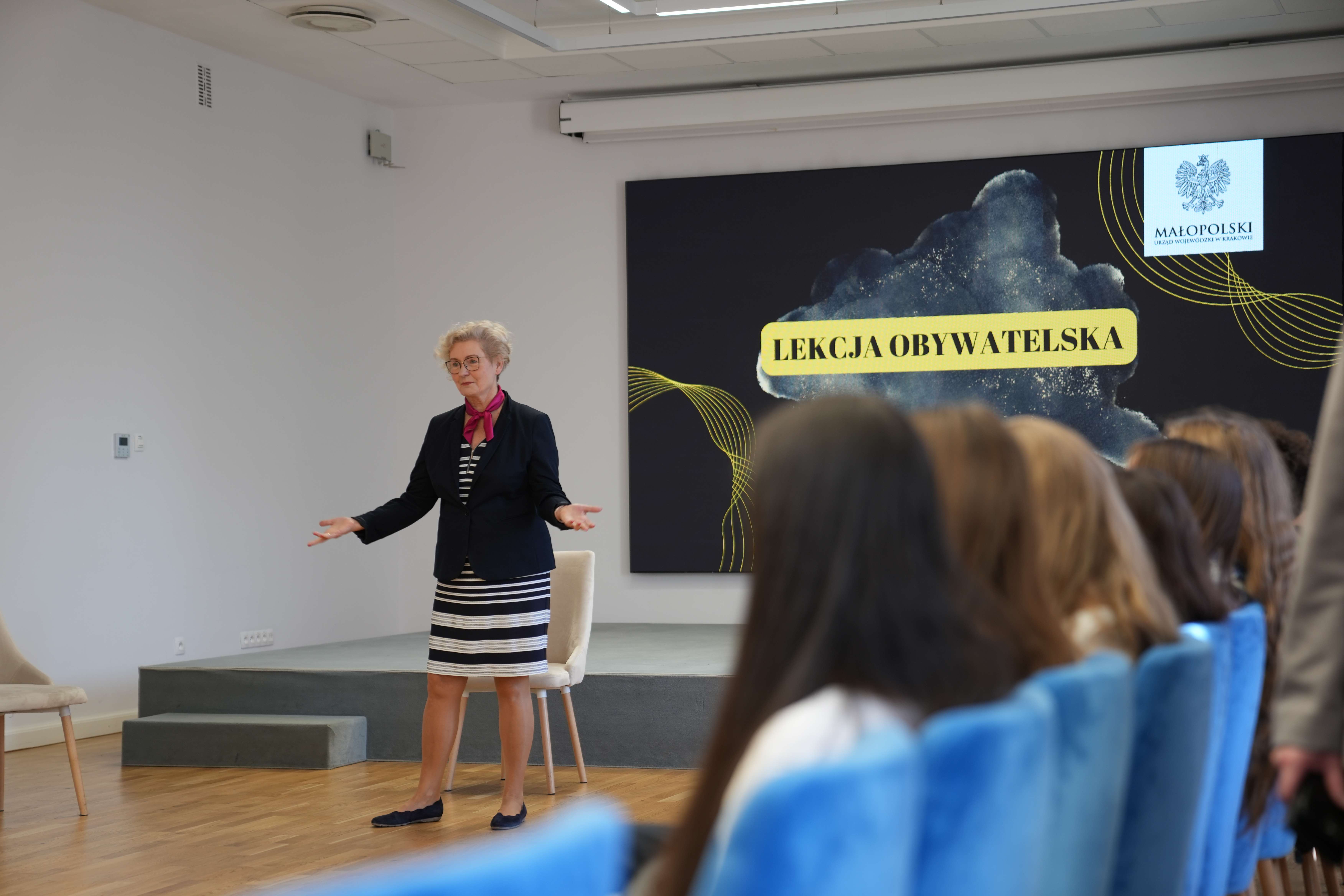 - Budowanie świadomości, jak funkcjonuje państwo, jest bardzo ważne wśród osób, które stoją u progu dorosłości. Poznanie praw obywatelskich czy choćby rozpoznawanie różnic pomiędzy samorządem a administracją państwową, jest niezwykle ważne. Dlatego bardzo dziękuję Wam za przybycie i mam nadzieję, że dzisiejsze spotkanie zaprocentuje w Waszym dorosłym życiu - mówi I wicewojewoda małopolska Elżbieta Achinger.