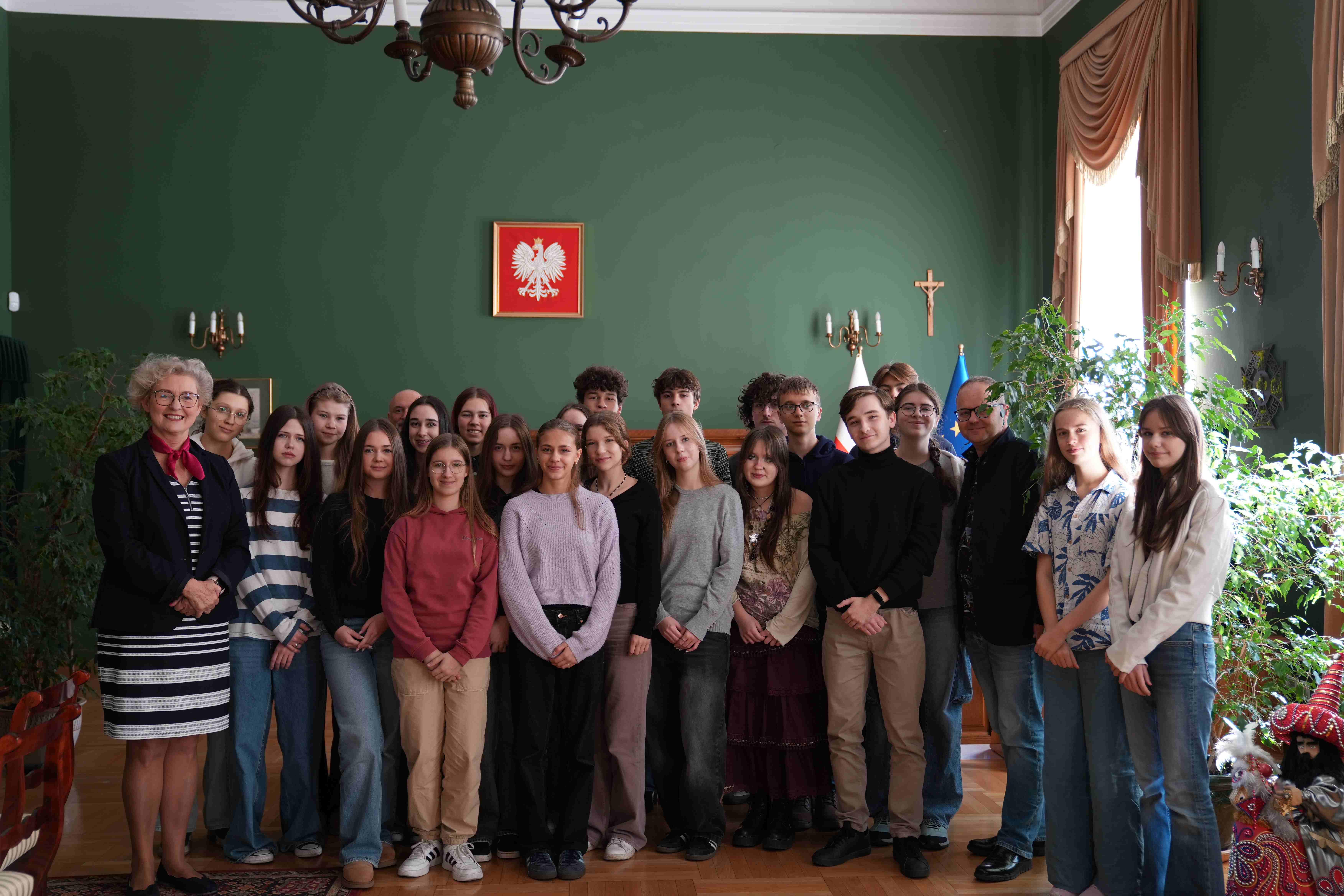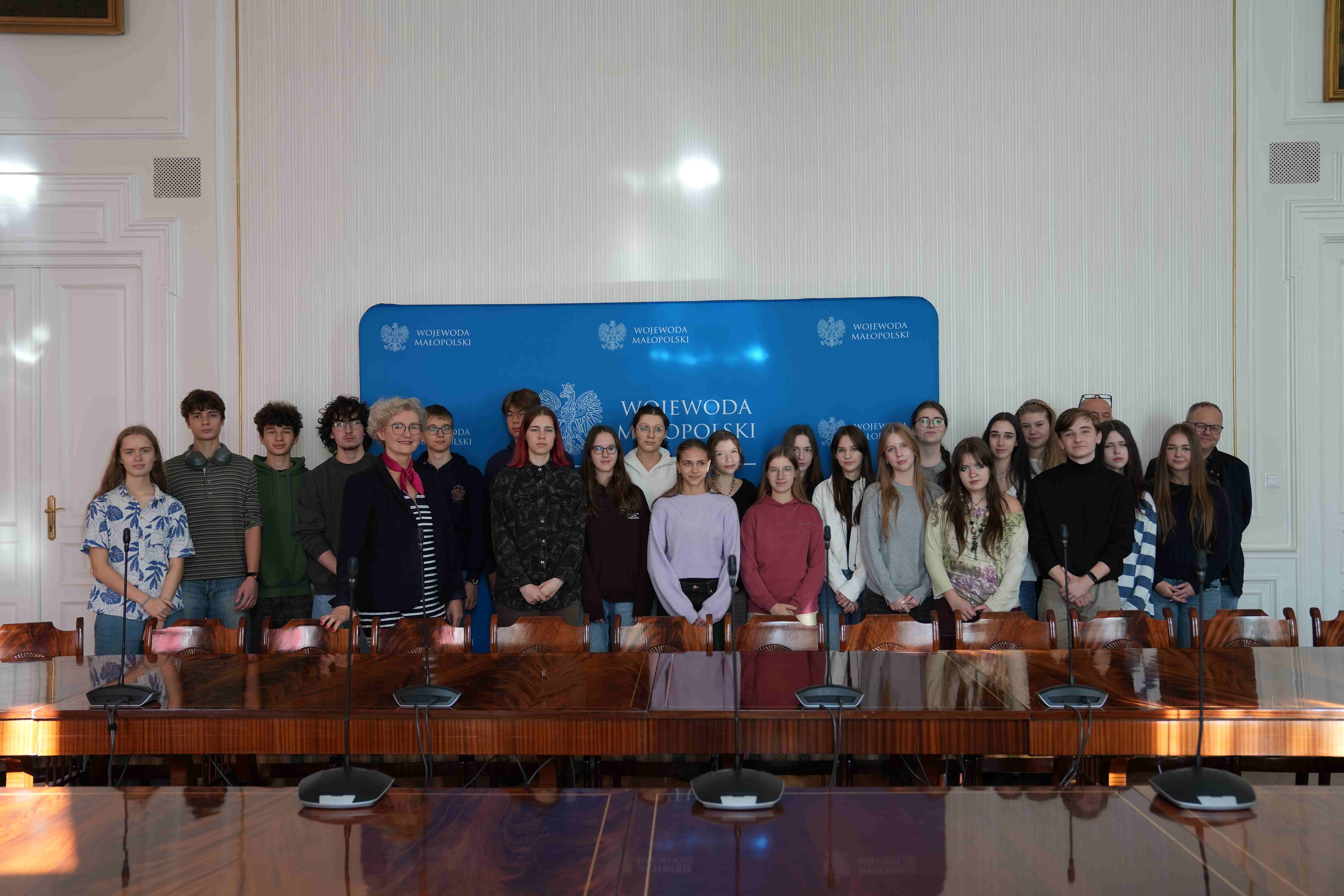 Na zdjęciu I wicewojewoda małopolska Elżbieta Achinger wraz z grupą uczniów ze szkoły zwiedzając gabinet wojewody. Na ścianie godło.