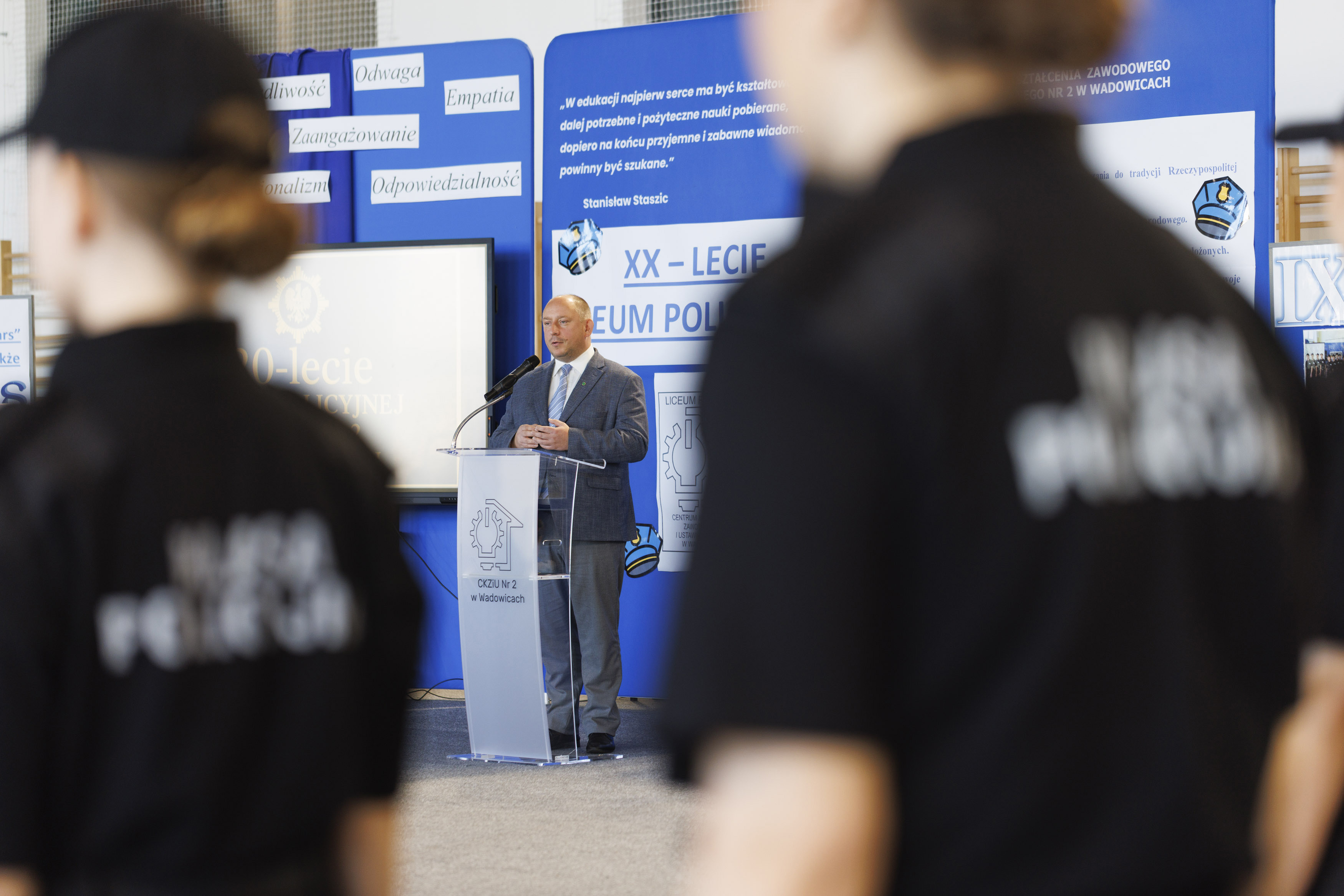 20 lat klas policyjnych w Wadowicach. Na zdjęciu wojewoda małopolski Krzysztof Jan Klęczar podczas przemówienia, widoczni są także uczniowie