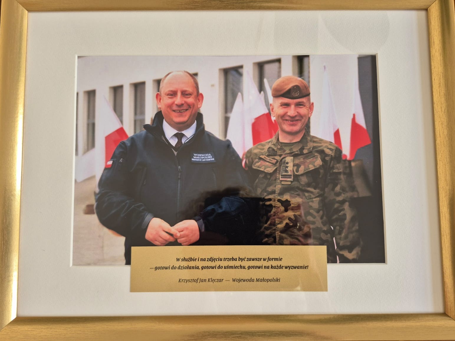 Na zdjęciu wojewoda Krzysztof Jan Klęczar oraz gen. bryg. Marcin Siudziński. Generał trzyma w ręce bordową teczkę, wojewoda podtrzymuje rękoma pamiątkową ramę ze zdjęciem. Na ciemnozielonej ścianie w tle wisi godło Polski.