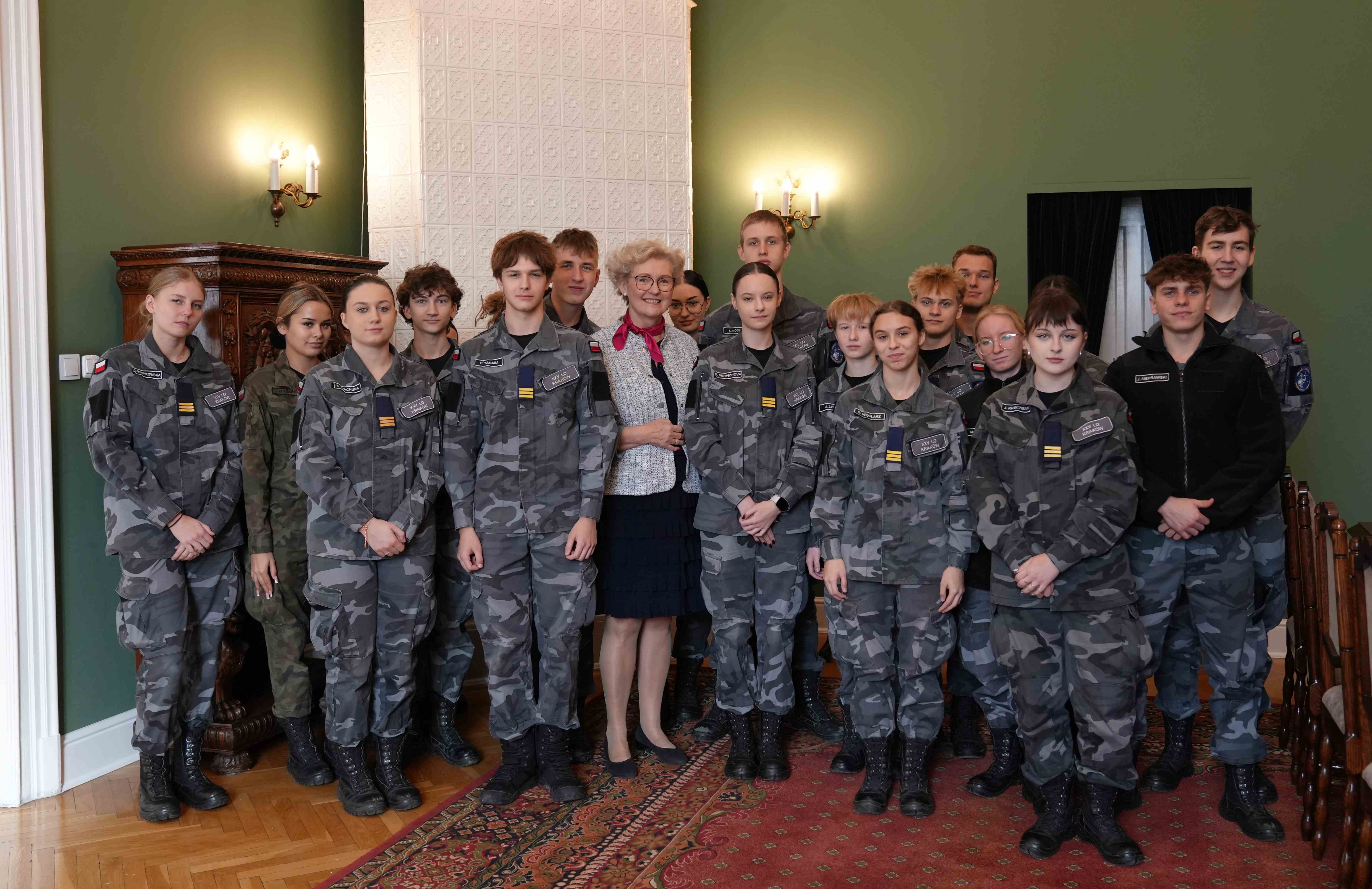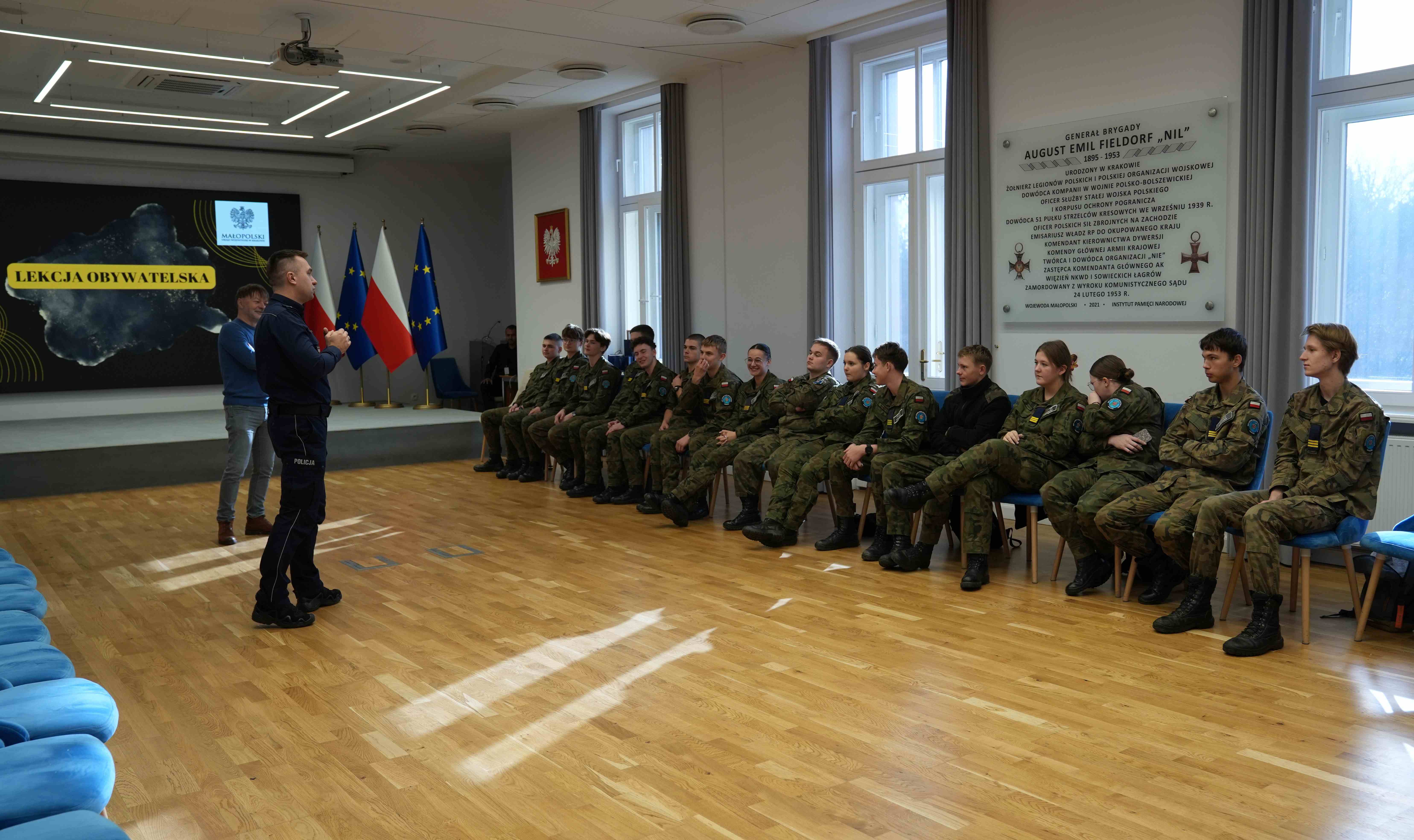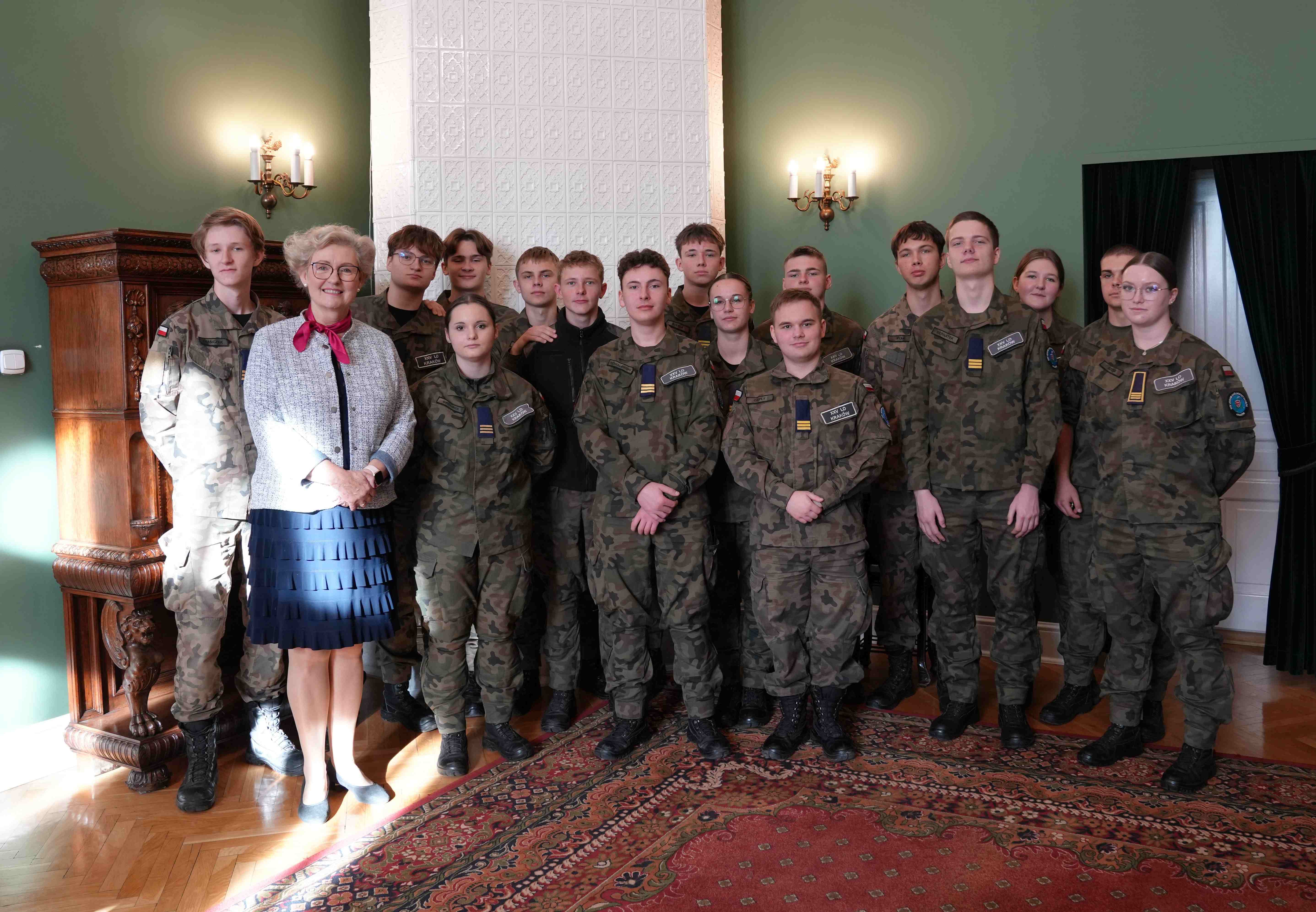 Zdjęcie grupowe. Wśród uczniów w szarych i zielonych mundurach stoi wicewojewoda małopolska Elżbieta Achinger oraz aspirant Maciej Kwiecień z Komendy Wojewódzkiej Policji w Krakowie