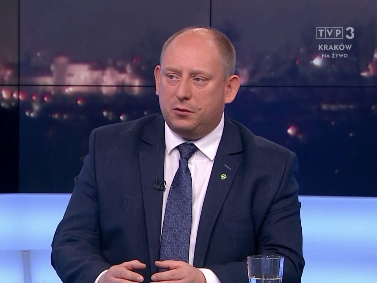 Grafika z cytatem wojewoda małopolskiego Krzysztofa Jana Klęczara z programu Tematy Dnia w TVP3 Kraków. W górnej części grafiki widoczny jest wojewoda małopolski Krzysztof Jan Kleczar podczas programu