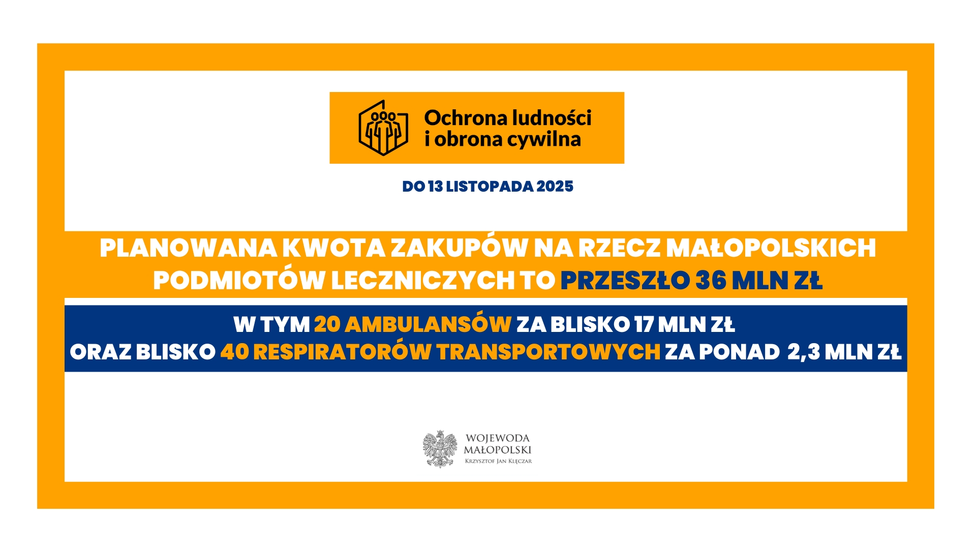 - To niezwykle ważne, że z Programu Ochrony Ludności i Obrony Cywilnej kupowany jest także sprzęt wzmacniający szpitale. To m.in. karetki z napędem 4x4, bardzo istotnym z punktu widzenia specyfiki małopolskiego terenu. Planowany jest zakup w tym roku 20 ambulansów za łącznie blisko 17 mln zł. W zależności od wyposażenia koszt jednego ambulansu to przedział od ok. 600 tys. zł do nawet miliona złotych. To także m.in. blisko 40 sztuk respiratorów transportowych za ponad 2,3 mln zł. Łączna planowana kwota zakupów w ramach Programu Ochrony Ludności i Obrony Cywilnej z przeznaczeniem dla podmiotów leczniczych (głównie dysponentów szpitalnych oddziałów ratunkowych oraz zespołów ratownictwa medycznego) to przeszło 36 mln zł – przekazuje wojewoda małopolski Krzysztof Jan Klęczar.