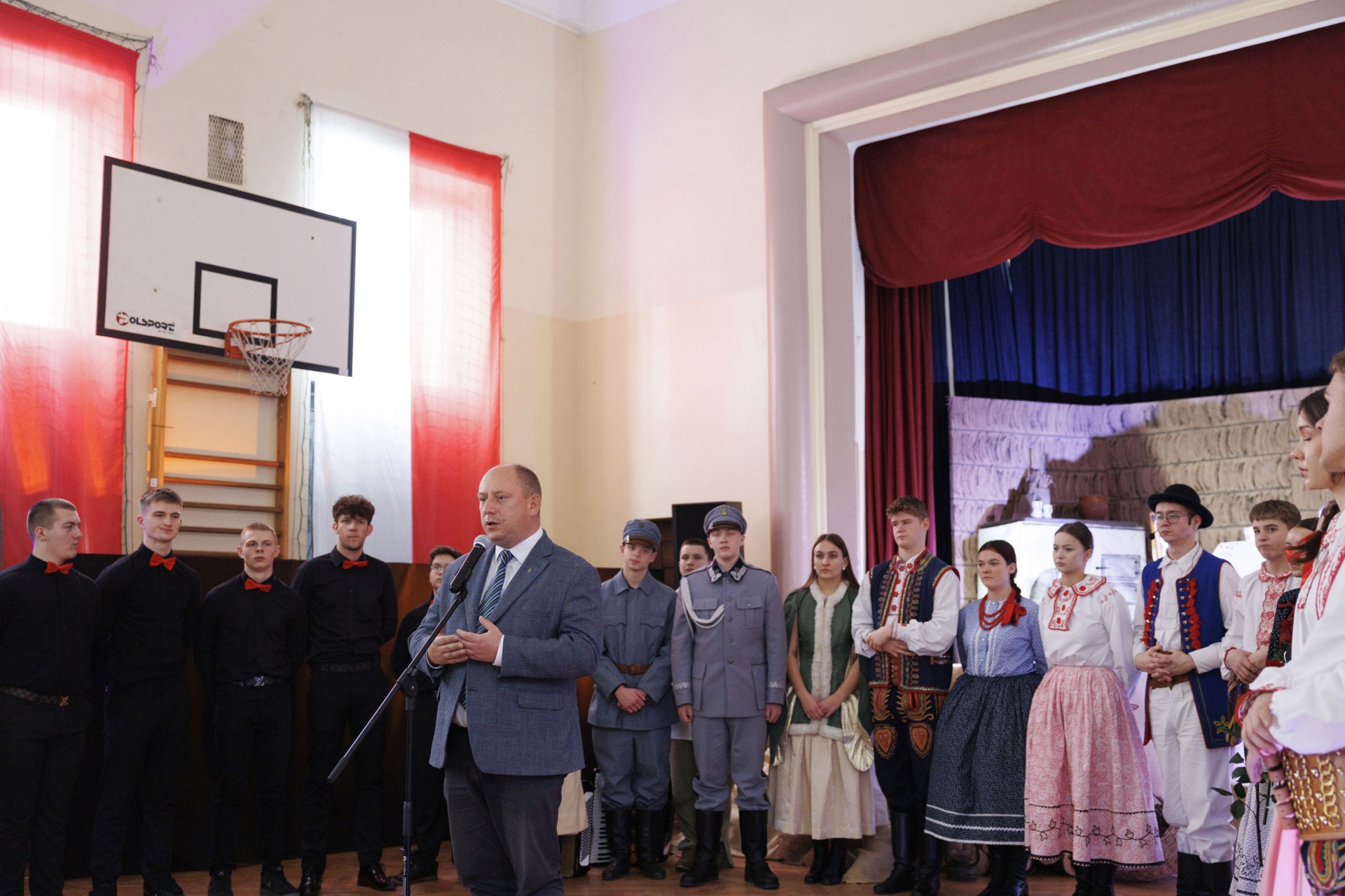 Wicepremier, minister obrony narodowej Władysław Kosiniak-Kamysz przemawia do mikrofonu. Obok znajduje się biało-czerwona flaga
